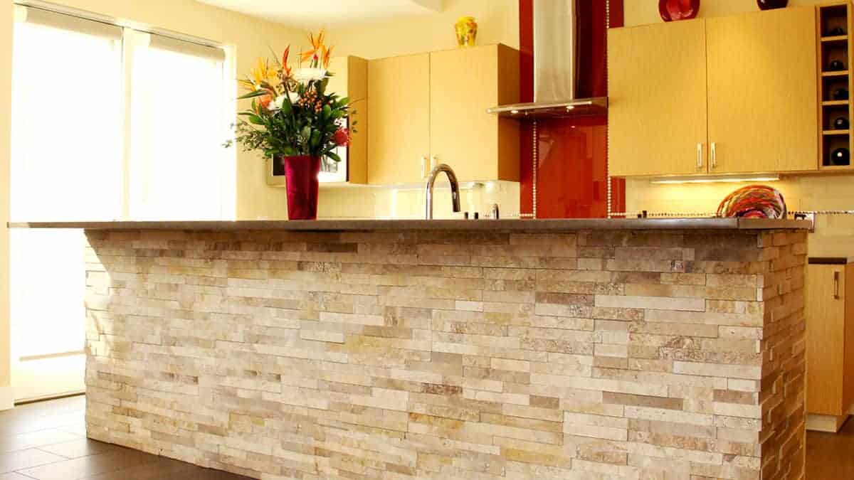 A beautiful kitchen with a warm and inviting appeal is complimented with the Latte Honed natural stone panels.